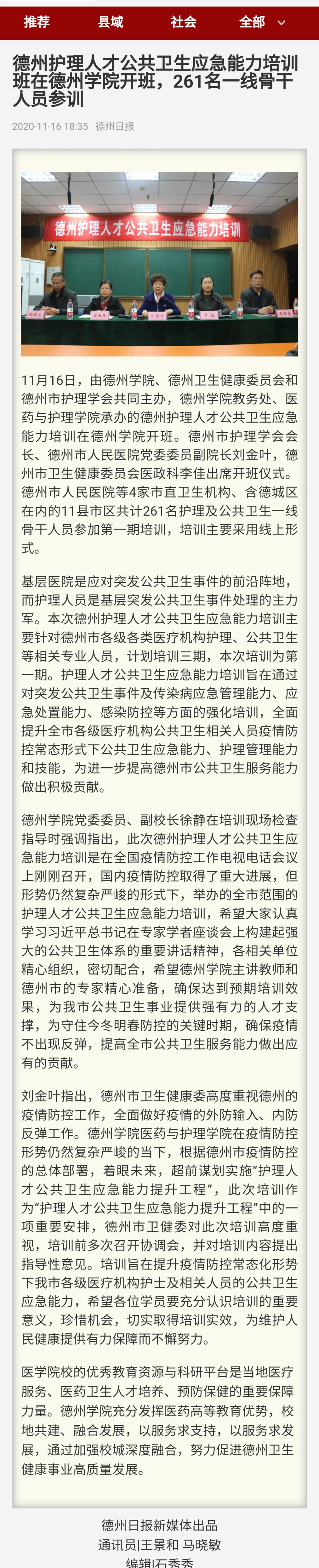 【德州日报】德州护理人才公共卫生应急能力培训班在beat365官方网站开班,261名一线骨干人员参训