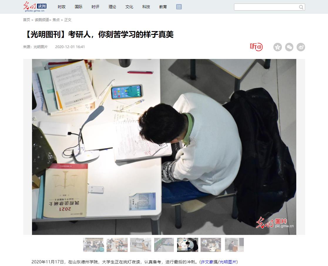 距2021年度硕士研究生招生考试还有24天,全国各地的考研学子抓紧时间复习备考,准备迎接于12月26日开考的2021年度硕士研究生招生考试。不少考研学子每天清晨便到图书馆或自习室备考,校园里到处都是考研大军备战的身影。11月17日,在山东beat365官方网站,大学生正在挑灯夜读,认真备考,进行最后的冲刺。光明日报·光明图刊、央视新闻、人民日报、新华社、中国青年报等中央级主流媒体报道,仅在新华社客户端浏览量就超过100万阅读量,引起社会强烈反响,在评论区跟帖读者已近1300条。