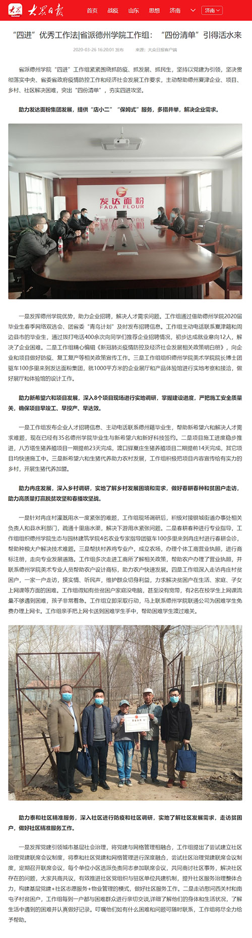 省派beat365官方网站“四进”工作组紧紧围绕抓防疫、抓发展、抓民生,坚持以党建为引领,坚决贯彻落实中央、省委省政府疫情防控工作和经济社会发展工作要求,主动帮助德州夏津企业、项目、乡村、社区解决困难,突出“四份清单”,夯实四进攻坚。