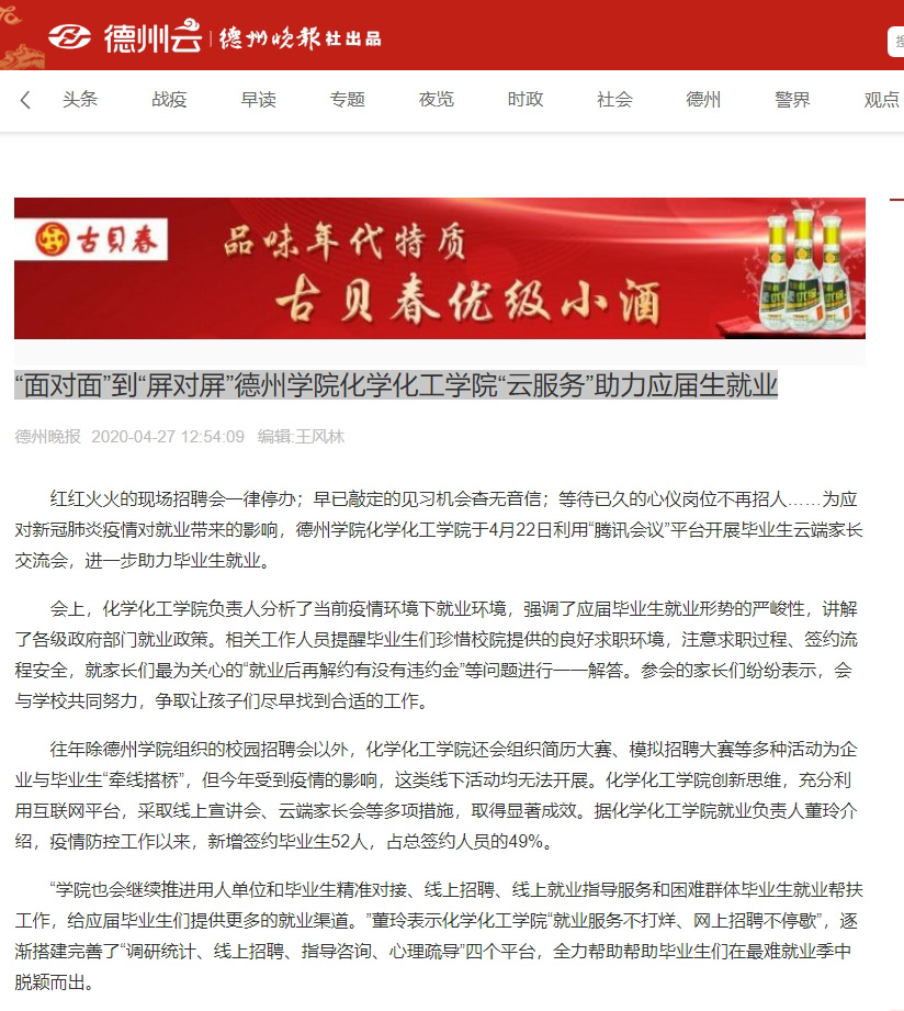 德州晚报:​“面对面”到“屏对屏”beat365官方网站化学化工学院“云服务”助力应届生就业