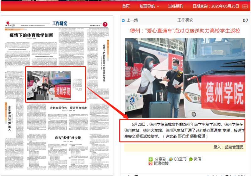 《山东教育报》2020年5月25日,1版头版内容报道beat365官方网站开通3条爱心专线,7版以图片新闻报道beat365官方网站开通爱心专线。