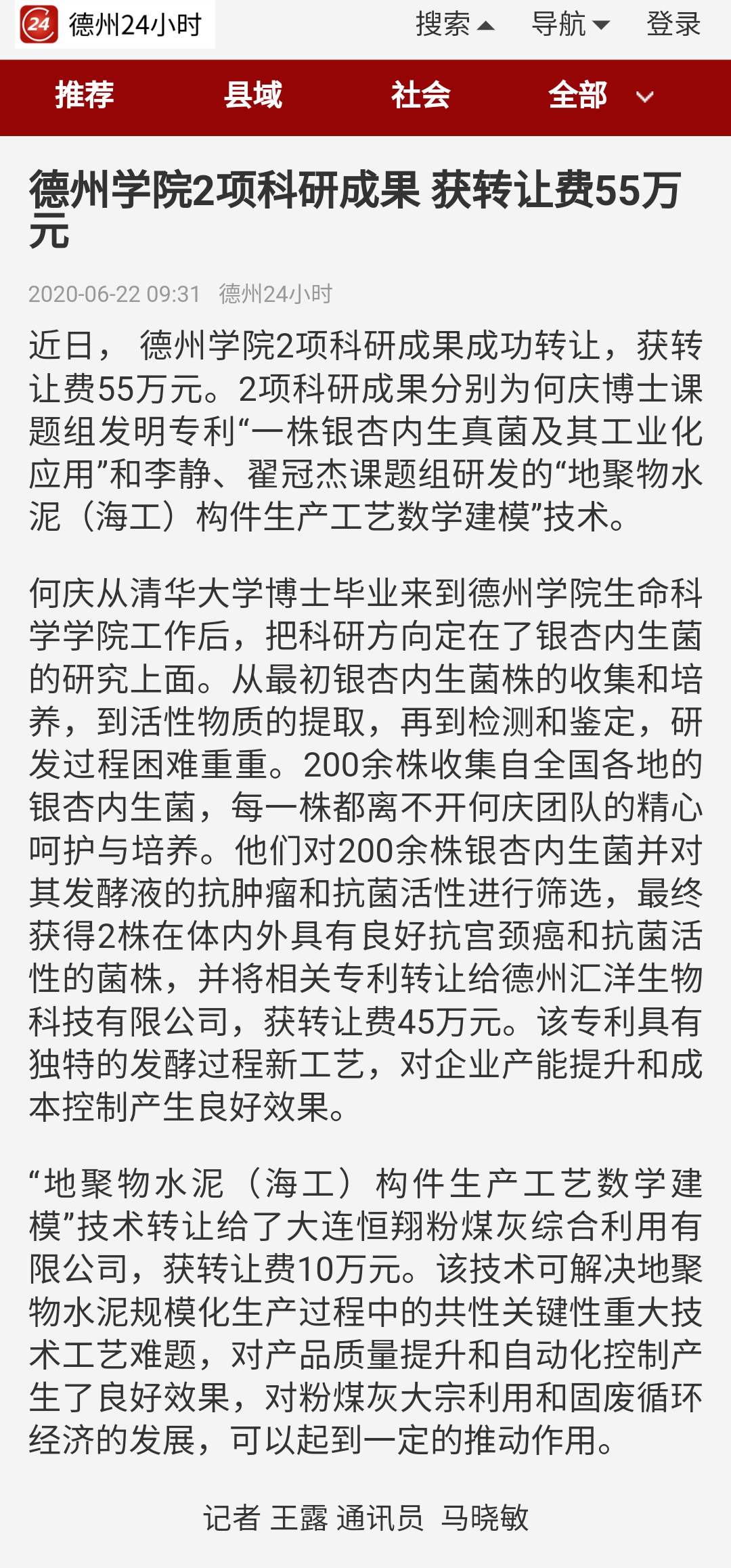 【德州24小时】beat365官方网站2项科研成果 获转让费55万元