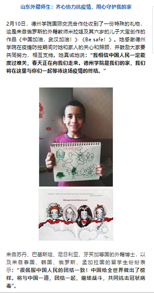 2月10日,国际交流合作处收到了一份特殊的礼物,就是来自俄罗斯的外籍教师米拉娃及其六岁的儿子大宝创作的作品《中国加油,武汉加油!》《Be safe!》。她感谢学校在疫情防控期间对她和家人的关心和照顾,并鼓励大家要共同努力,相互支持。中华人民共和国外交部外事管理司微信公众号“外事管理”对此进行了报道。