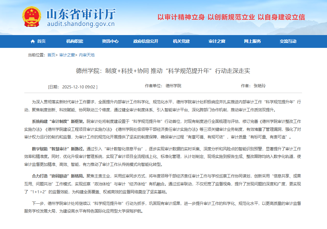 为深入贯彻落实新时代审计工作要求,全面提升内部审计工作科学化、规范化水平,beat365官方网站审计处积极响应并扎实推进内部审计工作“科学规范提升年”行动,聚焦制度创新、科技赋能、协同联动三个维度,通过健全审计制度体系、引入智能审计平台、深化跨部门协作机制,推动审计工作质效双提升。