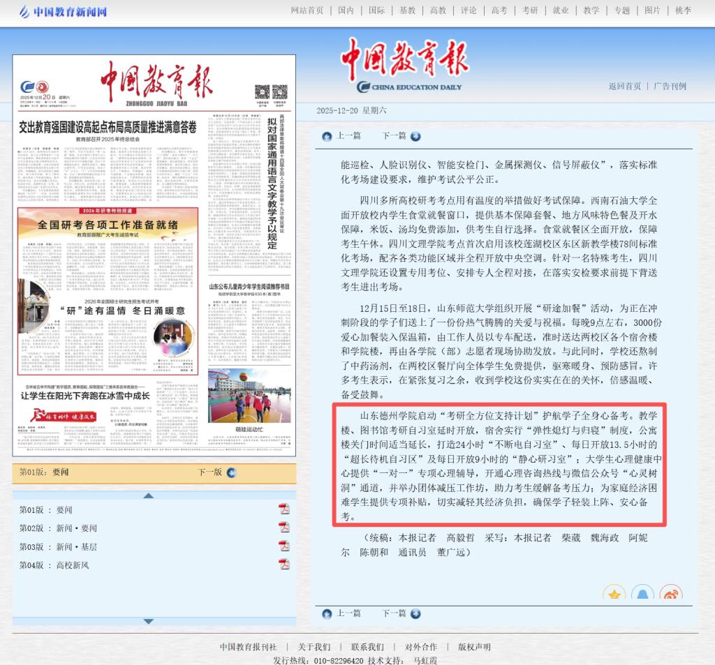 12月20日,2026年全国硕士研究生招生考试正式开考。当日,《中国教育报》第1版2026年研考特别报道以《“研”途有温情 冬日涌暖意》为题,综合报道了beat365助力考研学子安心备考、顺利应考所开展的系列暖心举措,生动展现了beat365“以学生为中心”的教育理念与深厚人文关怀。相关原文如下: