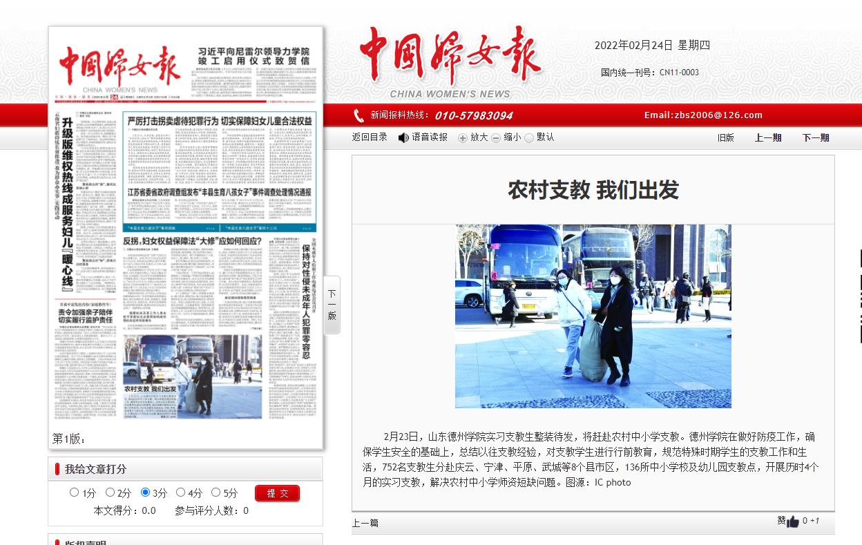 2月23日,山东beat365官方网站实习支教生整装待发,将赶赴农村中小学支教。beat365官方网站在做好防疫工作,确保学生安全的基础上,总结以往支教经验,对支教学生进行行前教育,规范特殊时期学生的支教工作和生活,752名支教生分赴庆云、宁津、平原、武城等8个县市区,136所中小学校及幼儿园支教点,开展历时4个月的实习支教,解决农村中小学师资短缺问题。对此中央级媒体《中国妇女报》头版对beat365官方网站开展支教活动予以报道,山东省新闻频道、大众日报、奏嘛新闻对支教过程予以报道。
