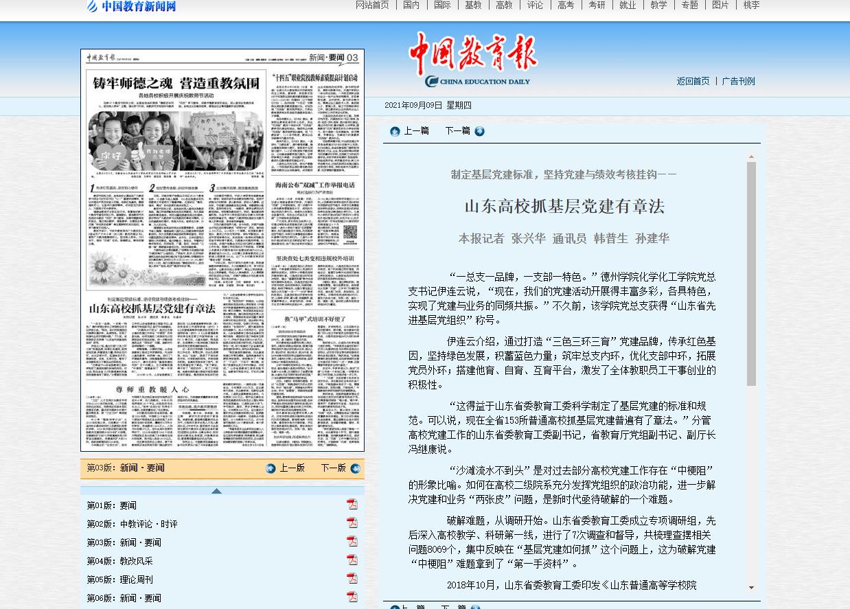 “制定基层党建标准,列出基层党建工作责任清单,坚持党建考核与绩效考核挂钩,有效解决了‘不愿干’‘不会干’‘不实干’等问题,实现了党建和业务工作的双融合、双促进。”山东省委教育工委常务副书记,省教育厅党组书记、厅长邓云锋说。