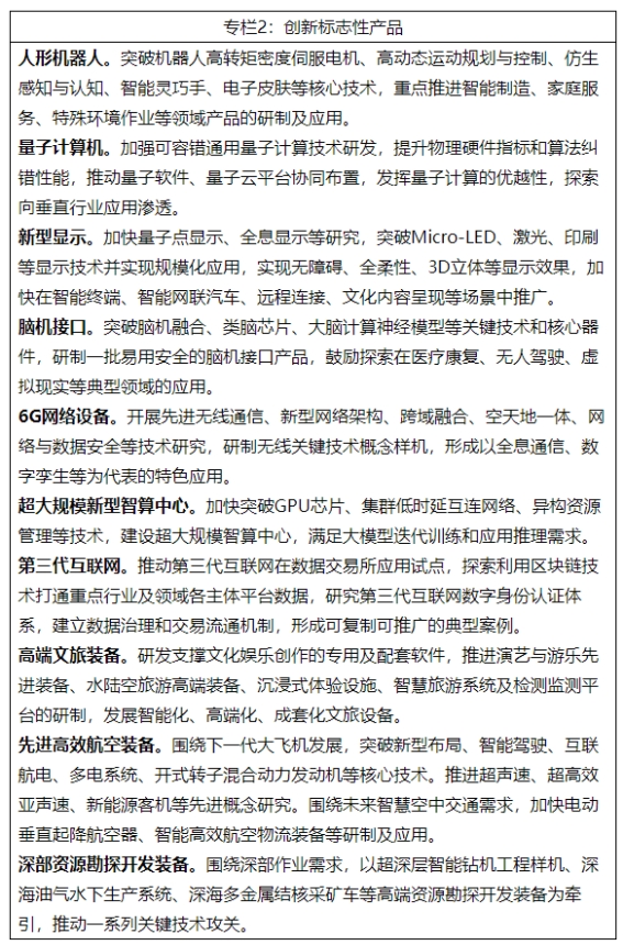 6.做强未来高端装备。面向国家重大战略需求和人民美好生活需要,加快实施重大技术装备攻关工程,突破人形机器人、量子计算机、超高速列车、下一代大飞机、绿色智能船舶、无人船艇等高端装备产品,以整机带动新技术产业化落地,打造全球领先的高端装备体系。深入实施产业基础再造工程,补齐基础元器件、基础零部件、基础材料、基础工艺和基础软件等短板,夯实未来产业发展根基。