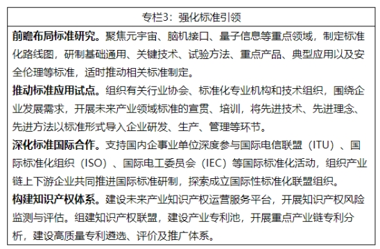 13.加强标准引领与专利护航。结合未来产业发展需求,统筹布局未来产业标准化发展路线,加快重点标准研制。针对重点标准适时开展宣贯和培训,引导企业对标达标,加速未来产业标准应用推广。促进标准、专利与技术协同发展,引导企业将自主知识产权与技术标准相融合。完善关键领域自主知识产权建设及储备机制,深化国际国内知识产权组织协作,构建未来产业高质量专利遴选、评价及推广体系。