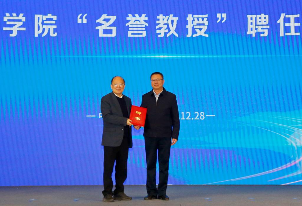 吴君为陈十一颁发“名誉教授”聘书。