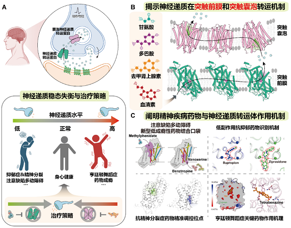 阐明单胺类神经递质转运机制及相关精神疾病药物调控机理成果示意图