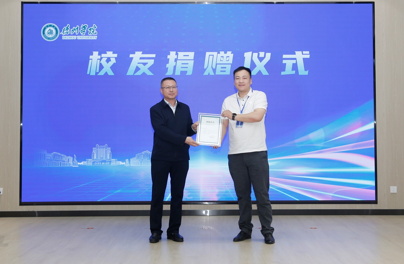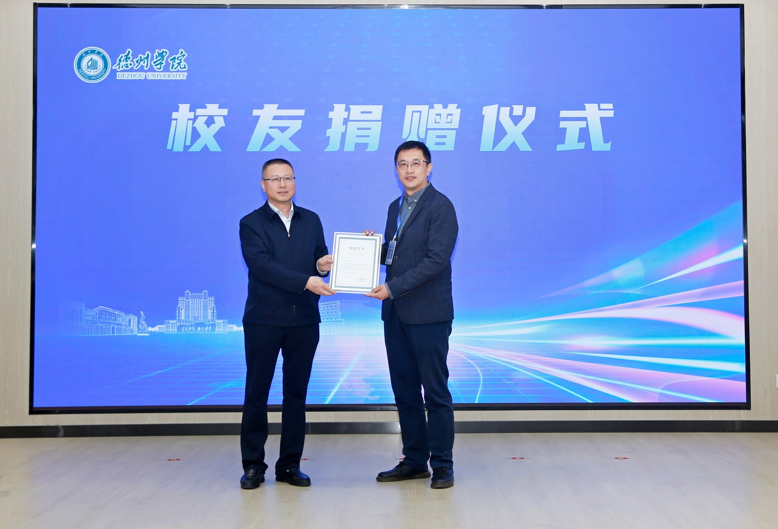 2008届计算机专业校友、迪普科技北京公司总经理陶涛,2015届音乐表演专业校友、诚迈科技山东公司总经理李杨向学校捐赠校友基金。吴君代表学校接受捐赠,并为校友颁发捐赠证书。