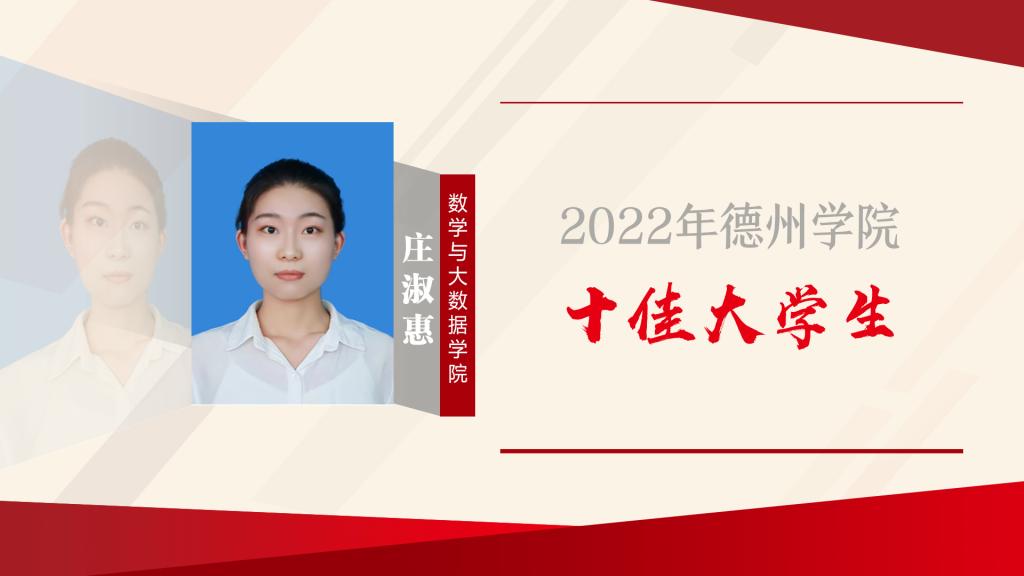 庄淑惠,中共预备党员,数学与大数据学院2019级数学科学与大数据专业学生。自入学以后,庄淑惠全面发展、不断进步,荣获“2022年山东省优秀大学生”;学习上脚踏实地,第二学年的学业成绩与综合成绩均位列全级第一,荣获“优秀大学生奖学金”和“国家奖学金”等;积极搭建知识与应用的桥梁,参加各类竞赛并获“全国大学生数学建模竞赛山东省一等奖”等荣誉证书;身为学生干部,对待工作认真负责,荣获“优秀共青团干部”等荣...