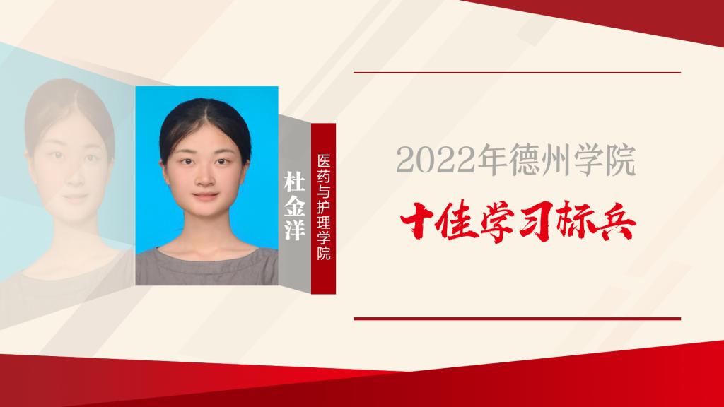 杜金洋,中共党员,医药与护理学院2019级生物制药专业学生。在校期间,杜金洋学业成绩位列班级第一,综合测评成绩位于班级第二。曾获得国家奖学金,2019-2020年度优秀大学生奖学金,2019-2020以及2020-2021三好学生荣誉称号。她三年平均成绩绩点为3.69/5.00,现已通过英语四、六级考试。课余时间,她积极参与科研项目,作为项目负责人带领团队获得2021年全国生命科学竞赛山东赛区二等奖、省级三等奖,省级大创项目结项,获得202...