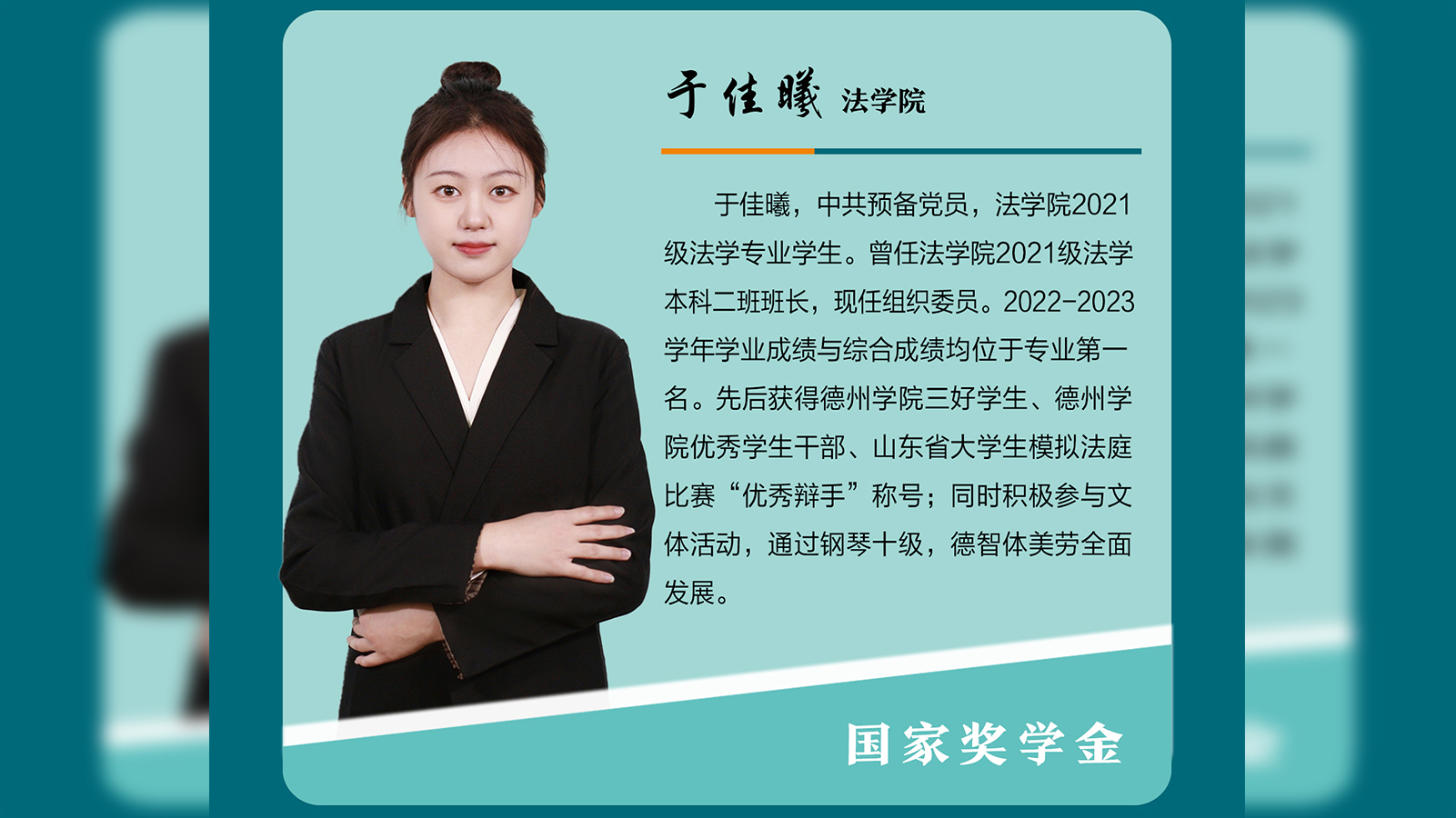 于佳曦,中共预备党员,法学院2021级法学专业学生。曾任法学院2021级法学本科二班班长,现任组织委员。2022-2023学年学业成绩与综合成绩均位于专业第一名。先后获得beat365官方网站三好学生、beat365官方网站优秀学生干部、山东省大学生模拟法庭比赛“优秀辩手”称号;同时积极参与文体活动,通过钢琴十级,德智体美劳全面发展。初心如磐,奋楫笃行面对学业,于佳曦砥志研思,精进不休。她利用空余时间,顺利考取了计算机二级证书、国际人才...