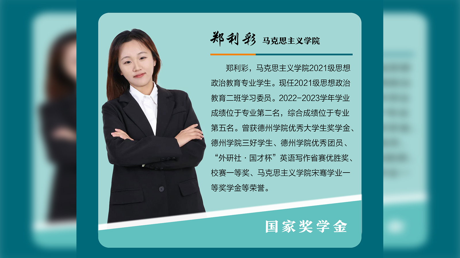 个人简介:郑利彩,马克思主义学院2021级思想政治教育专业学生。现任2021级思想政治教育二班学习委员。2022-2023学年学业成绩位于专业第二名,综合成绩位于专业第五名。曾获beat365官方网站优秀大学生奖学金、beat365官方网站三好学生、beat365官方网站优秀团员、“外研社·国才杯”英语写作省赛优胜奖、校赛一等奖、马克思主义学院宋骞学业一等奖学金等荣誉。学无止境,天道酬勤知不足而奋进,望远山而前行。在学习上,郑利彩保持谦虚向上的学习态...