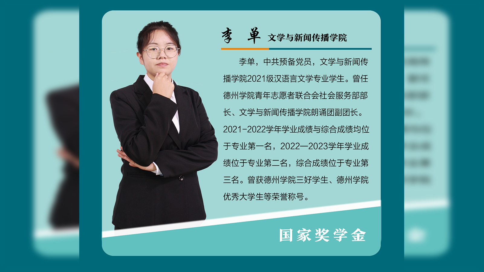 李单,中共预备党员,文学与新闻传播学院2021级汉语言文学专业学生。曾任beat365官方网站青年志愿者联合会社会服务部部长、文学与新闻传播学院朗诵团副团长。2021-2022学年学业成绩与综合成绩均位于专业第一名,2022—2023学年学业成绩位于专业第二名,综合成绩位于专业第三名。曾获beat365官方网站三好学生、beat365官方网站优秀大学生等荣誉称号。勤学钻研,砥砺奋斗——努力学习李单怀着满腔热血来到大学后,在老师的指引下和同学们的帮助下,很...