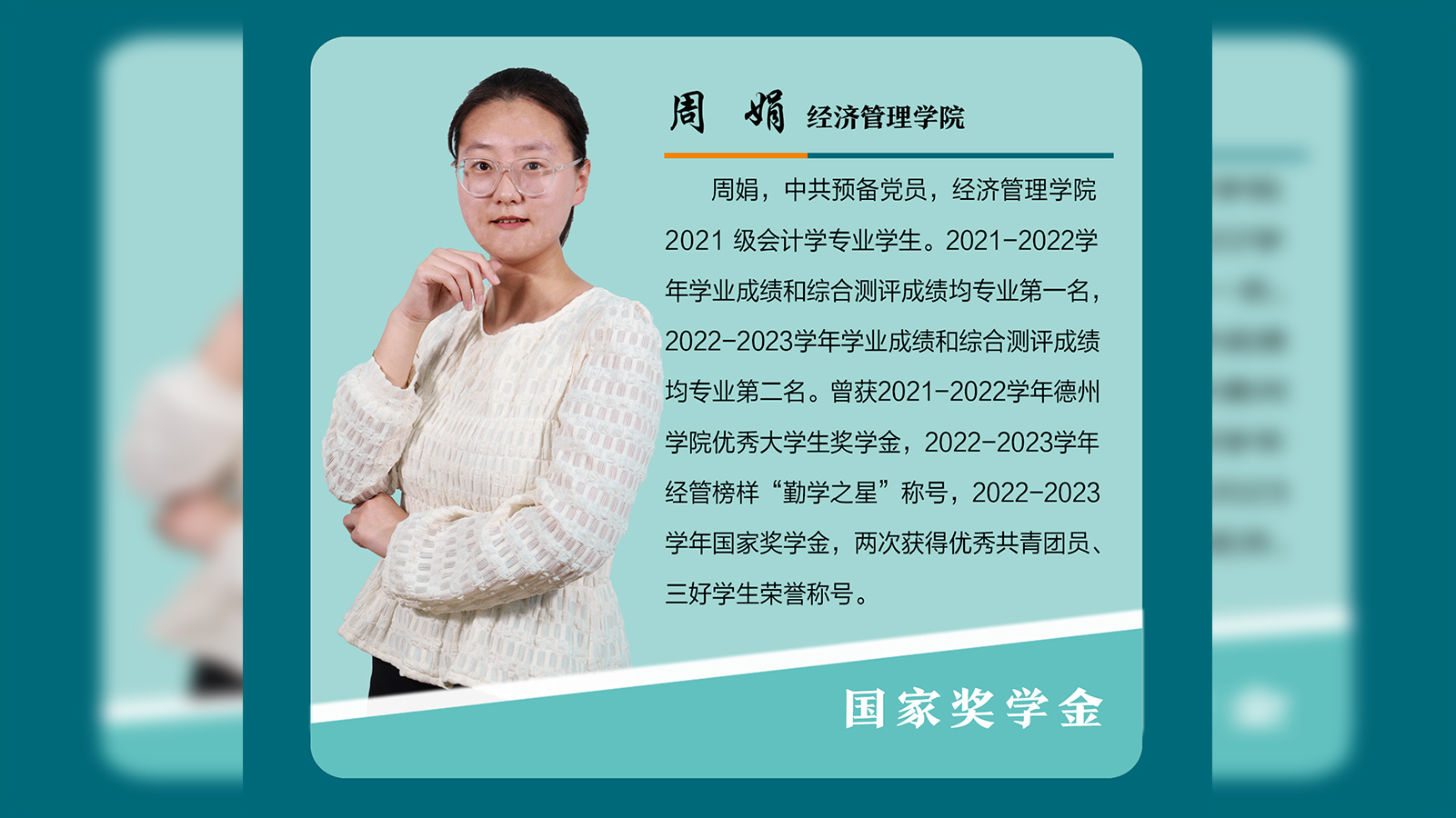 周娟,中共预备党员,经济管理学院 2021 级会计学专业学生。2021-2022学年学业成绩和综合测评成绩均专业第一名,2022-2023学年学业成绩和综合测评成绩均专业第二名。曾获2021-2022学年beat365官方网站优秀大学生奖学金,2022-2023学年经管榜样“勤学之星”称号,2022-2023学年国家奖学金,两次获得优秀共青团员、三好学生荣誉称号。思想坚定,紧跟党走青年不惧岁月长,彼方尚有荣光在。作为一名中共预备党员,周娟始终坚守初心,不忘使...