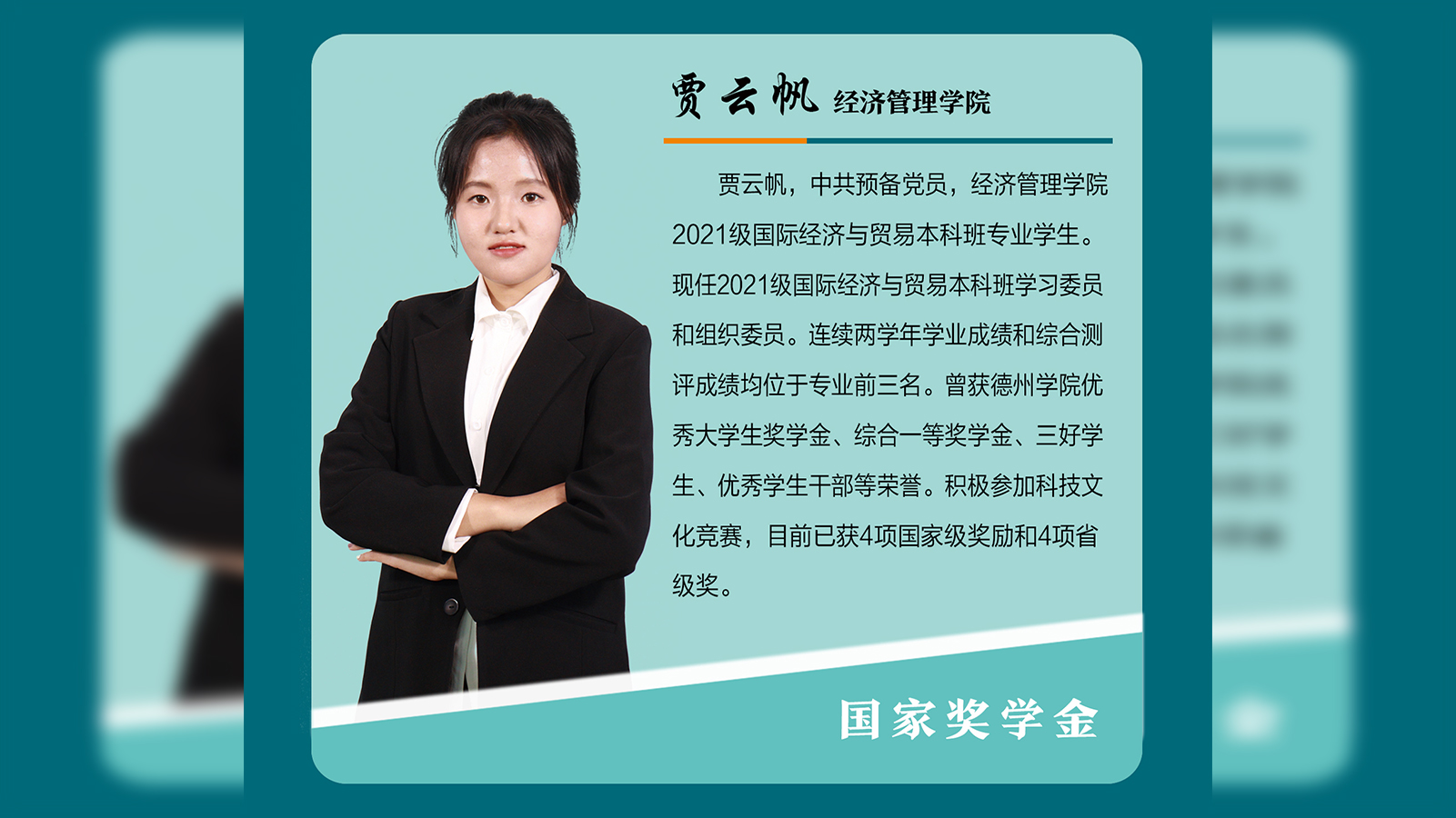 贾云帆,中共预备党员,经济管理学院2021级国际经济与贸易本科班专业学生。现任2021级国际经济与贸易本科班学习委员和组织委员。连续两学年学业成绩和综合测评成绩均位于专业前三名。曾获beat365官方网站优秀大学生奖学金、综合一等奖学金、三好学生、优秀学生干部等荣誉。积极参加科技文化竞赛,目前已获4项国家级奖励和4项省级奖。思想进步,与时俱进贾云帆入学以来,不断坚定信仰,砥砺前行。在思想上,她热爱祖国,热爱人民,思...