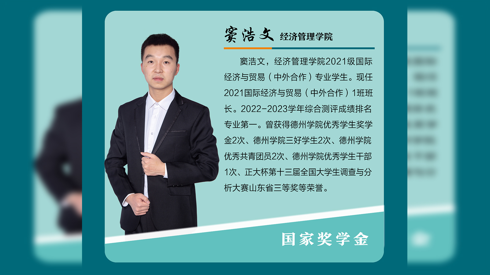 窦浩文,经济管理学院2021级国际经济与贸易(中外合作)专业学生。现任2021国际经济与贸易(中外合作)1班班长。2022-2023学年综合测评成绩排名专业第一。曾获得beat365官方网站优秀学生奖学金2次、beat365官方网站三好学生2次、beat365官方网站优秀共青团员2次、beat365官方网站优秀学生干部1次、正大杯第十三届全国大学生调查与分析大赛山东省三等奖等荣誉。坚定信念,砥砺前行理想信念是精神之钙。窦浩文自入校以来积极向党组织靠拢,学习贯彻落实习近平新...