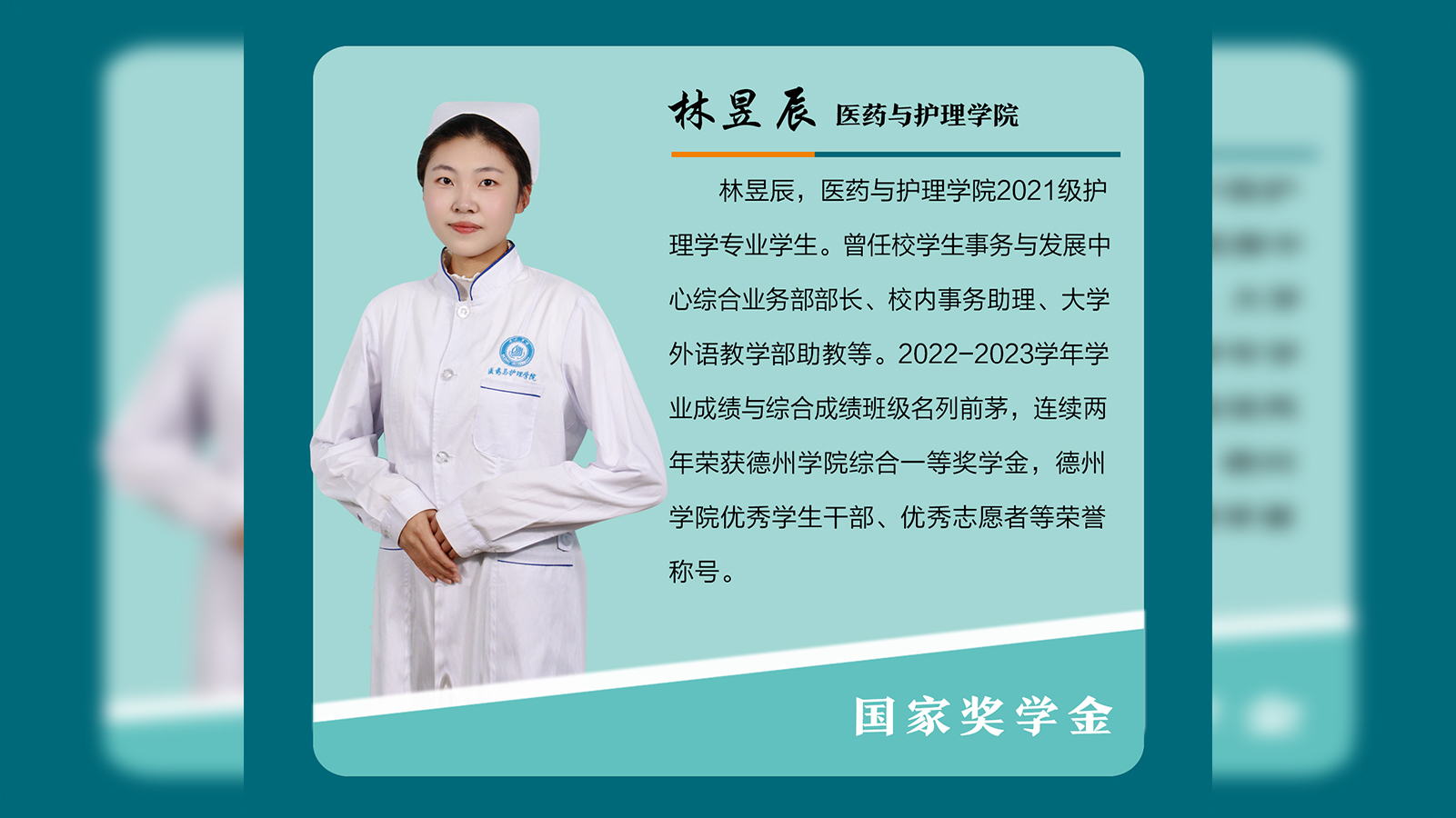 林昱辰,医药与护理学院2021级护理学专业学生。曾任校学生事务与发展中心综合业务部部长、校内事务助理、大学外语教学部助教等。2022-2023学年学业成绩与综合成绩班级名列前茅,连续两年荣获beat365官方网站综合一等奖学金,beat365官方网站优秀学生干部、优秀志愿者等荣誉称号。气有浩然,学无止境入学以来,林昱辰一直把学习当做第一要务,有着明确的学习目标和端正的学习态度。作为学生干部,她更加严格的要求自己,刻苦学习,认真钻研,...